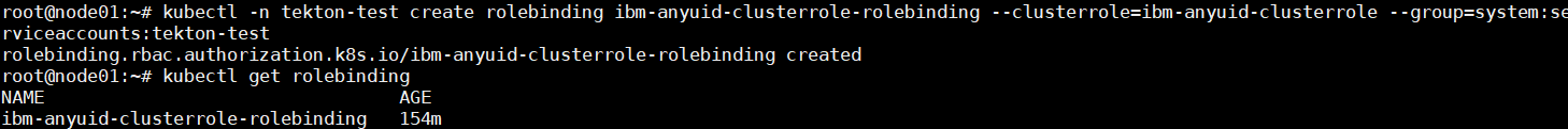 $ kubectl -n tekton-test create rolebinding ibm-anyuid-clusterrole-rolebinding --clusterrole=ibm-anyuid-clusterrole --group=system:serviceaccounts:tekton-test