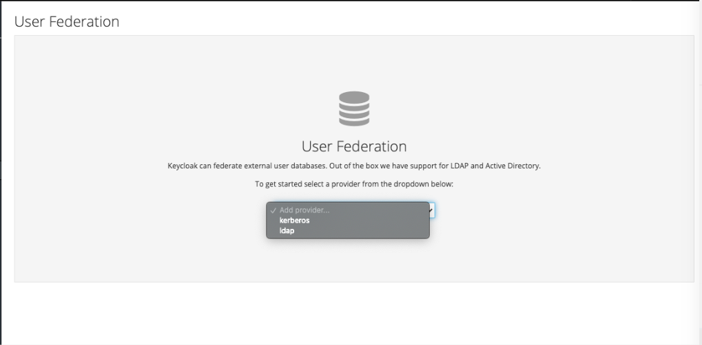 - user federation : ldap, AD 등 외부 user database와 연계