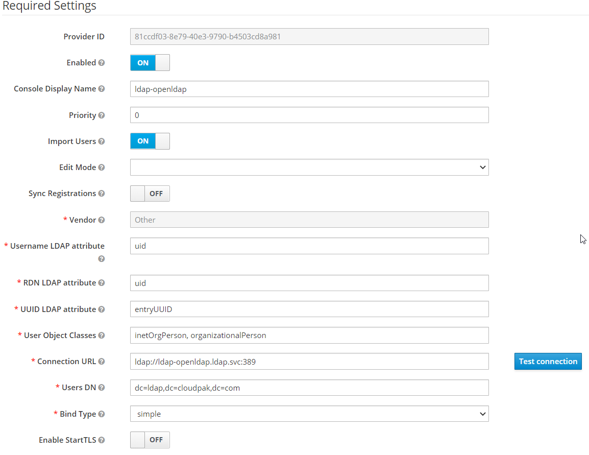 - Connection url : ldap://ldap-openldap.ldap.svc:389 ( 동일 클러스터 내에 있어서 service 명으로 접근 )