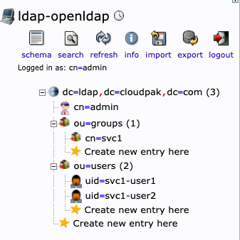 # Synchronize all users 하면 ldap에 생성한 svc1-user1, svc1-user2 가 보임