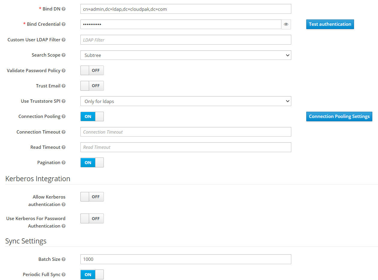 - Connection url : ldap://ldap-openldap.ldap.svc:389 ( 동일 클러스터 내에 있어서 service 명으로 접근 )