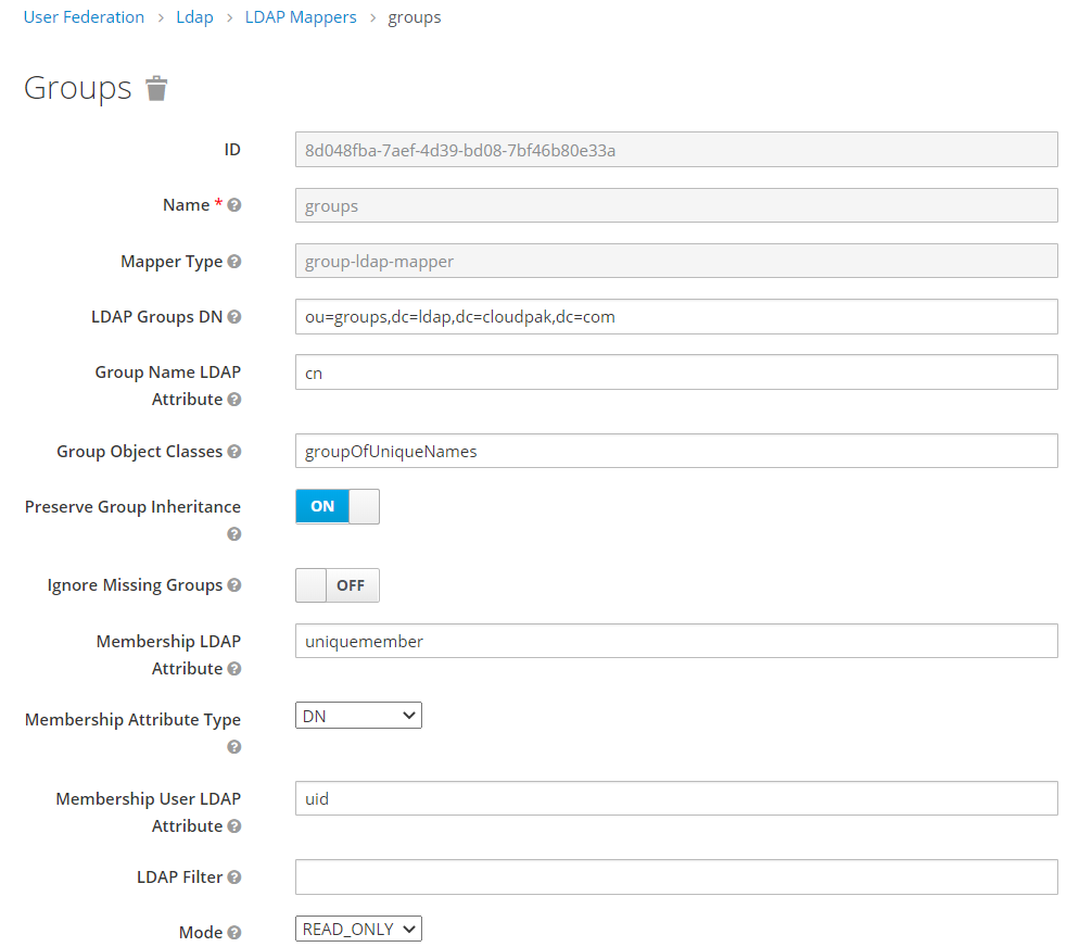 - LDAP group DN : ou=groups,dc=ldap,dc=cloudpak,dc=com